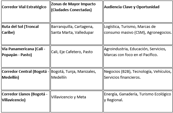 Mientras que Bogotá ofrece alta concentración, las carreteras ofrecen impacto sostenido y la oportunidad de alcanzar a viajeros, transportistas y audiencias regionales específicas.