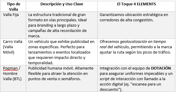 En 4 ELEMENTS MARKETING, entendemos que el futuro de la publicidad exterior (ATL/BTL) en Bogotá reside en su capacidad de dialogar con el mundo digital. Nuestro modelo de 4 Unidades de Negocio (ATL, BTL, DIGITAL y DOTACIÓN) asegura que cada impacto en la calle se convierta en una acción medible en línea.